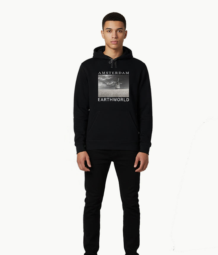 Amsterdam Hoodie. This hoodie is a premium and eco-friendly hoodie made from a blend of 85% organic cotton and 15% recycled polyester. The hoodie features a self-fabric lined hood, which adds extra comfort and style. The flat premium drawcords contribute to the hoodie's design. Overall, the hoodie combines style, sustainability, and premium craft.