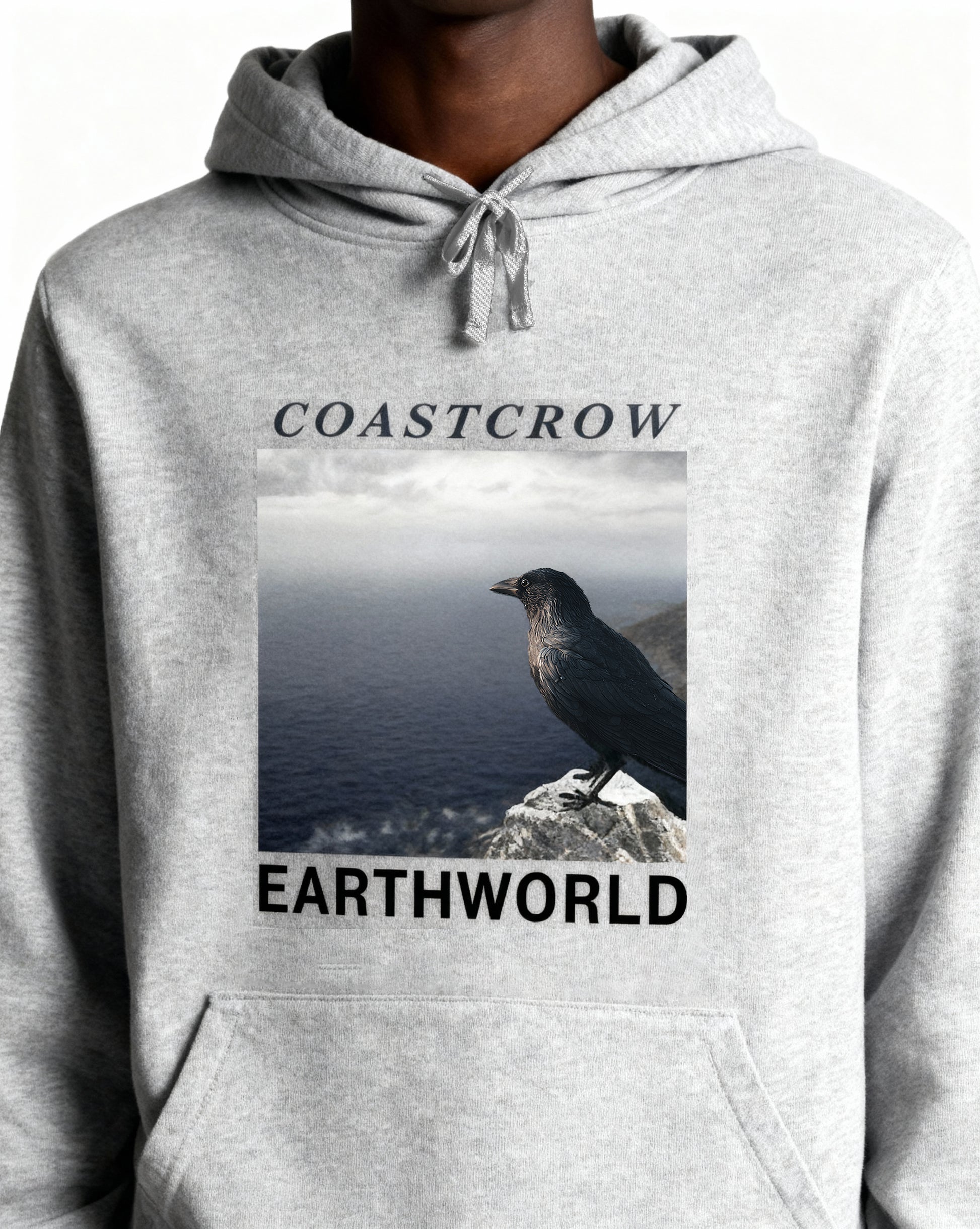 The Coastcrow hoodie. This hoodie is a premium and eco-friendly hoodie made from a blend of 85% organic cotton and 15% recycled polyester. The hoodie features a self-fabric lined hood, which adds extra comfort and style. The flat premium drawcords contribute to the hoodie's design. Overall, the hoodie combines style, sustainability, and premium craft.